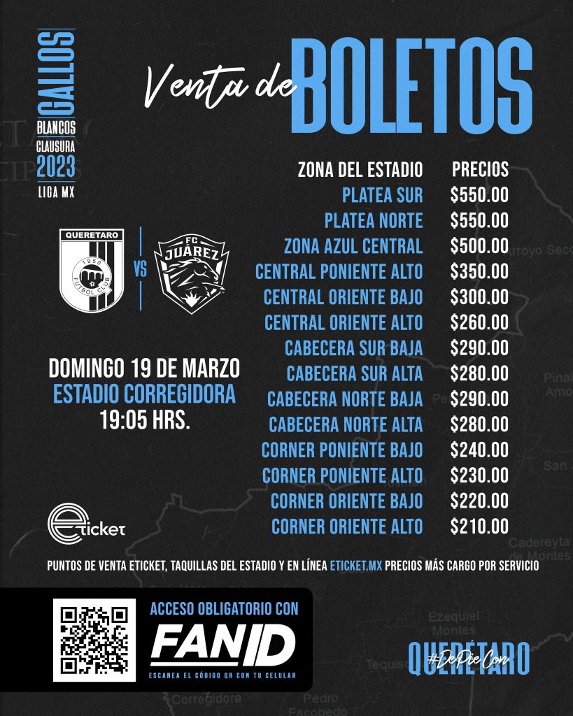 A pesar de que Gallos Blancos no ha tenido resultados positivos en el presente Torneo de Clausura 2023, los costos por un boleto son elevados, van desde los 210 pesos en la zona Corner Oriente Alto y las entradas más caras son las de Plateas Sur y Norte que valen 550 pesos.