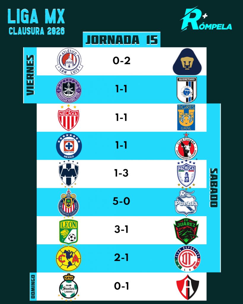La fecha 15 de la Liga MX ya es historia, con unas Chivas de Guadalajara que están imparables logrando récords en torneos cortos. Esta jornada nos dejó varios datos importantes del Torneo Clausura 2026.