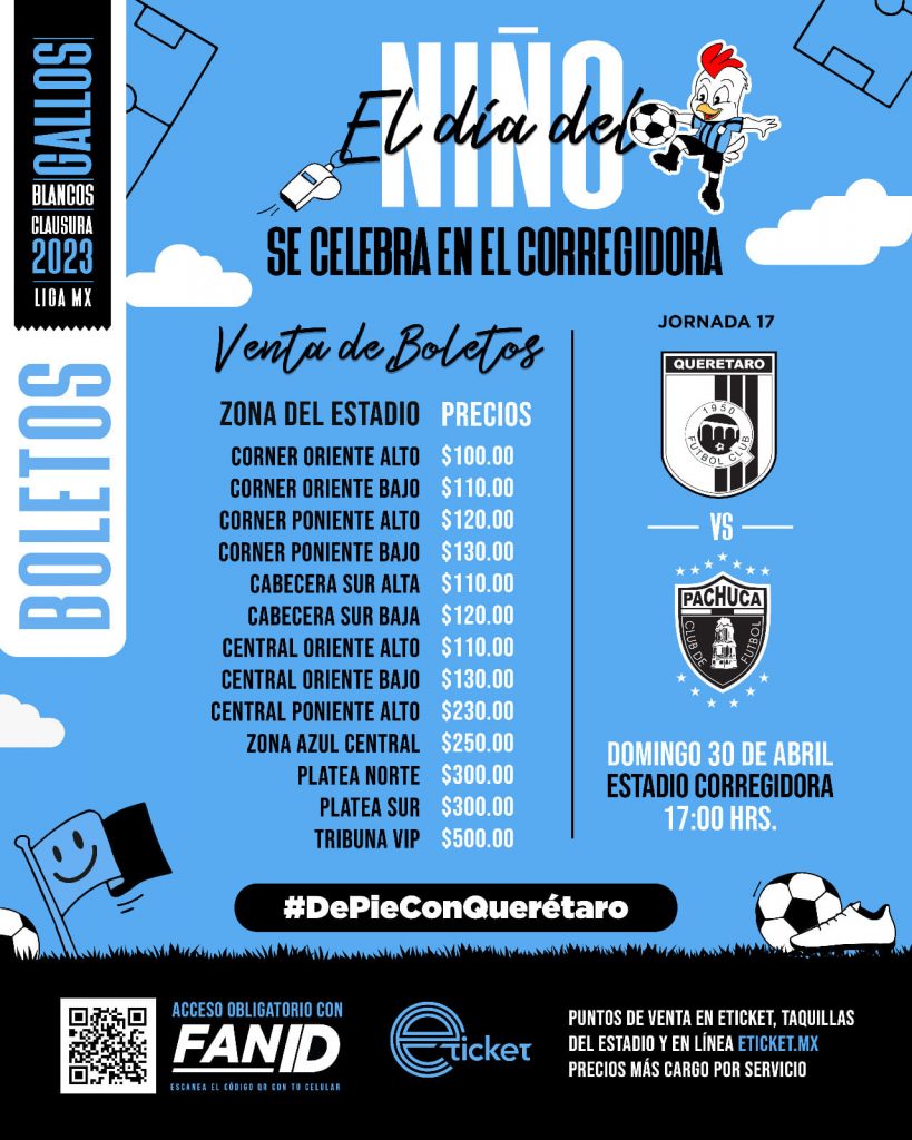 En redes sociales del club queretano se puede leer «El Día del Niño se Celebra en el Corregidora» y el boleto más barato cuesta 100 pesos en la zona Corner Oriente Alto, mientras que el más caro es el de la Tribuna VIP que vale 500 pesos.