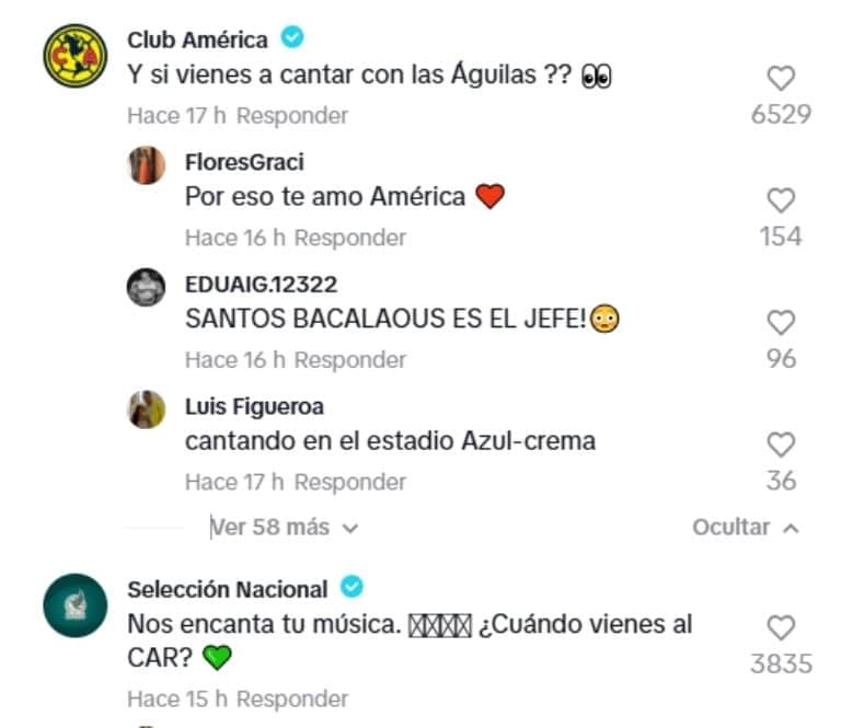 En su cuenta de TikTok, el cantautor recibió un comentario de la cuenta oficial de la Selección Mexicana en el que lo invitan al Centro de Alto Rendimiento; de la misma manera, se aprecia un comentario de la cuenta del Club América, en el que le hacen una invitación similar.