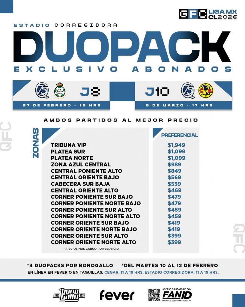A través de sus redes sociales el Querétaro FC informó que está a la venta el Duopack para los partidos que disputarán en el Estadio Corregidora contra Santos Laguna y el Club América, de la fecha 8 y 10, respectivamente.