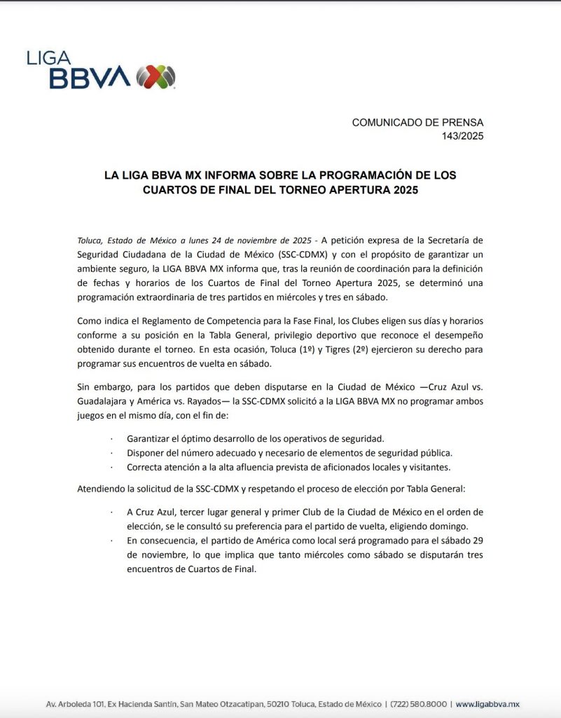 Tradicionalmente la Liga Mx programa dos partidos en miércoles y dos en jueves cuando es Liguilla, sin embargo, para este Apertura 2025 tuvieron que poner tres partidos en un día, debido a una recomendación por parte de las autoridades de la Ciudad de México.